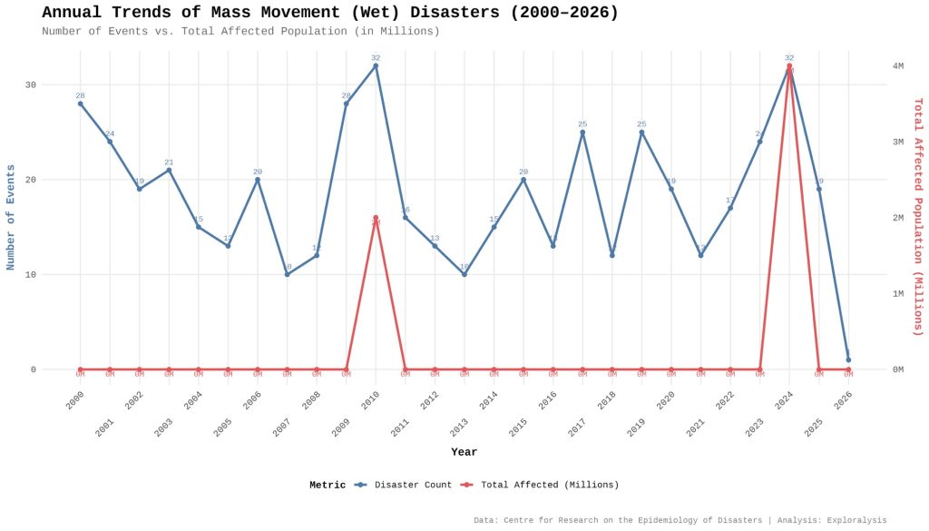 Annual trends of wet mass movement disasters (2000-2026) (Exploralysis)