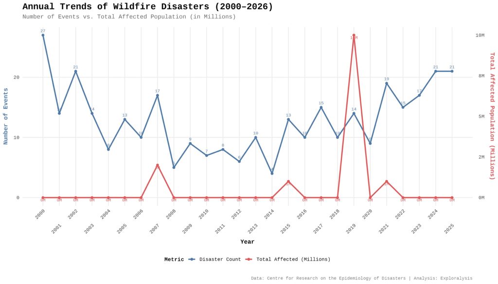 Annual trends of wildfire disasters (2000-2026) (Exploralysis)