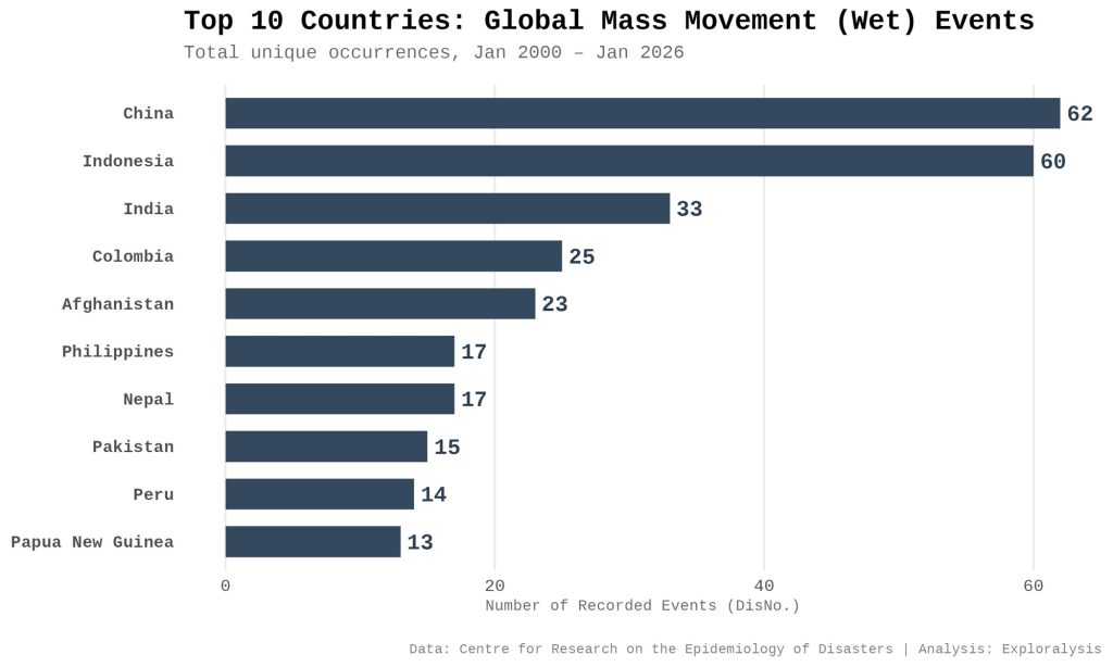 Top 10 countries: global wet mass movement events (Exploralysis)
