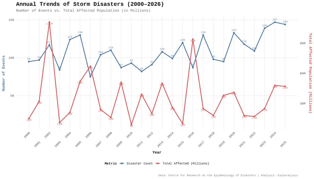 Annual trends of storm disasters (2000-2026) (Exploralysis)