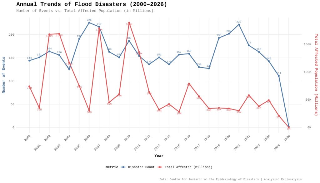 Annual trends of flood disasters (2000-2026) (Exploralysis)