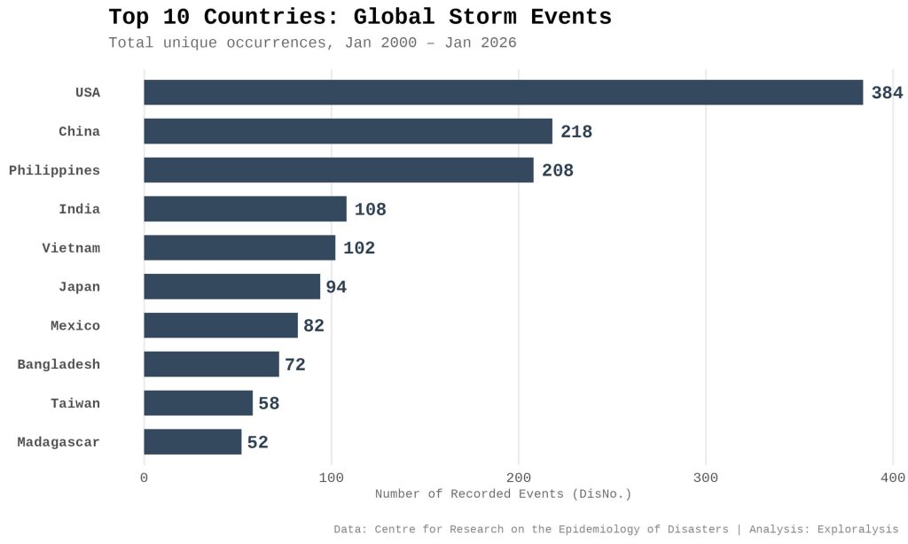 Top 10 countries: global storm events (Exploralysis)