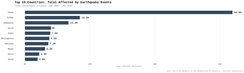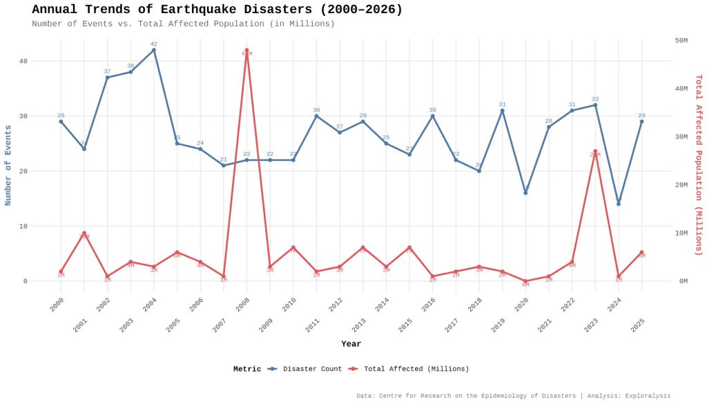 Annual trends of earthquake disasters (2000-2026) (Exploralysis)