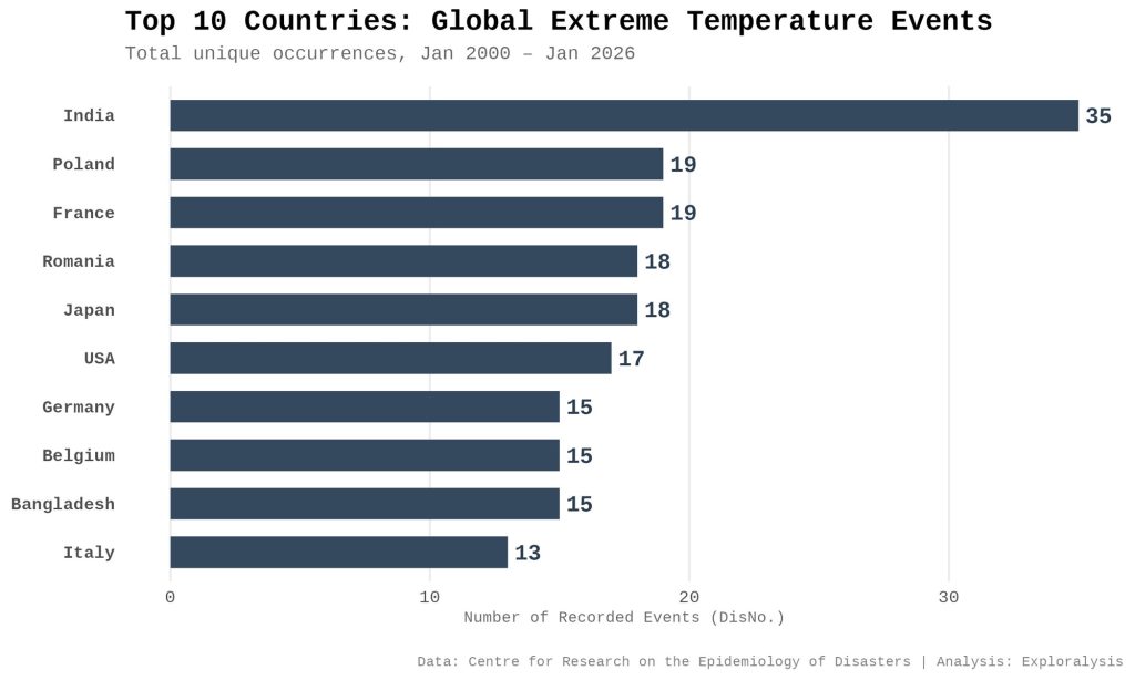 Top 10 countries: global extreme temperature events (Exploralysis)