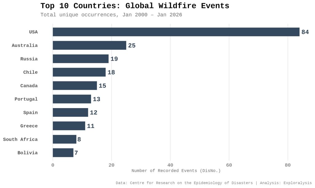 Top 10 countries: global wildfire events (Exploralysis)