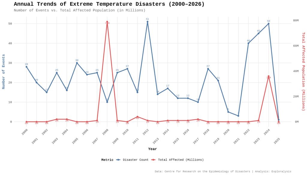 Annual trends of extreme temperature disasters (2000-2026) (Exploralysis)