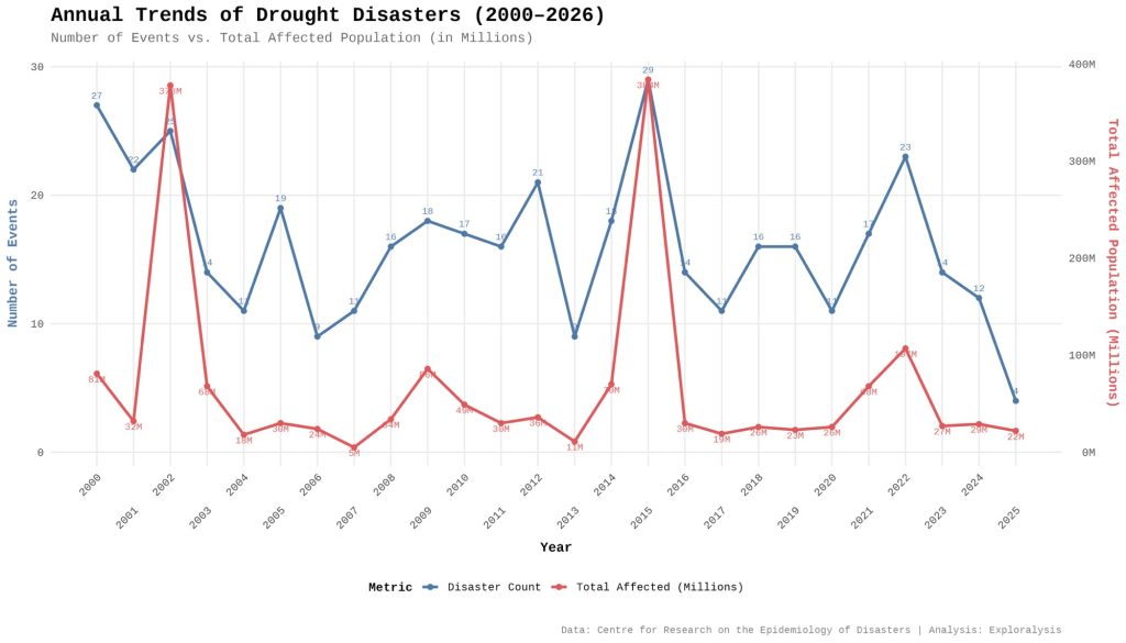 Annual trends of drought disasters (2000-2026) (Exploralysis)