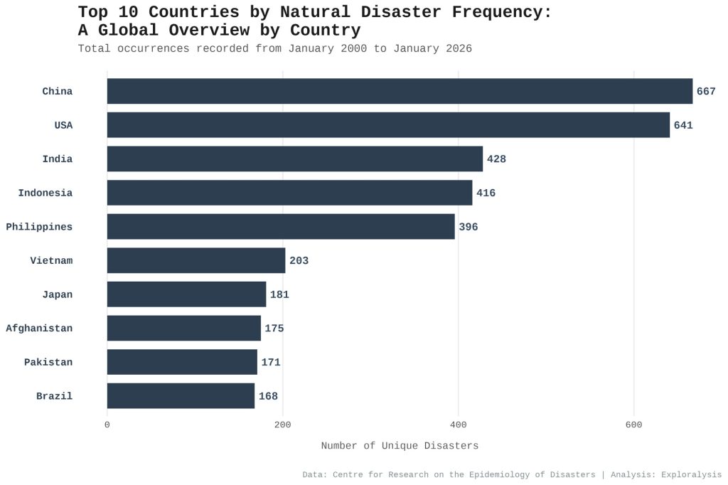 Top 10 countries by natural disaster frequency: a global overview by country (Exploralysis)
