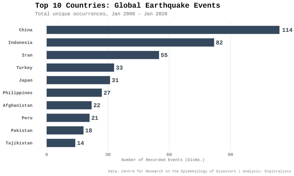 Top 10 countries: global earthquake events (Exploralysis)