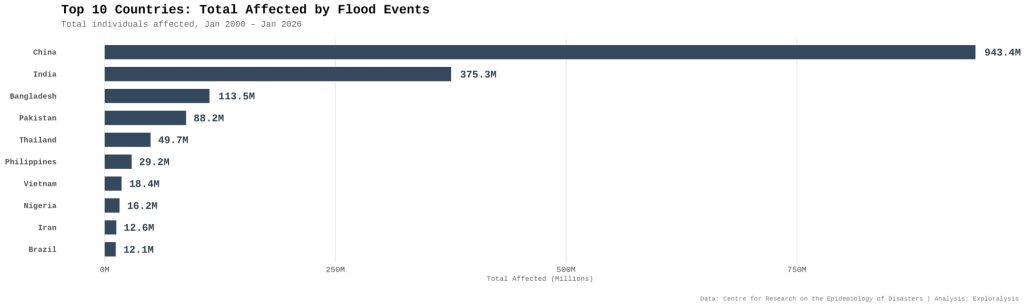 China, Indonesia, and India lead in flood events. China and India also top the list for people affected (943 million and 375 million respectively). Eight of the top 10 countries for both events and people affected are in Asia.