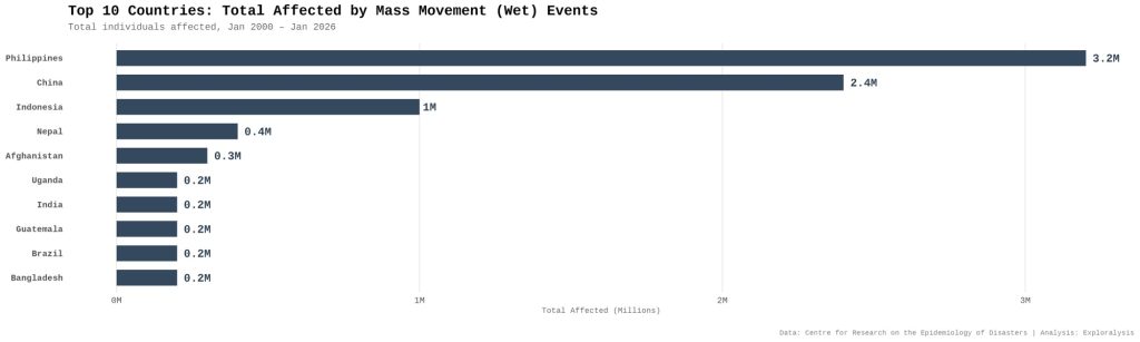 Top 10 countries: total affected by wet mass movements events (Exploralysis)