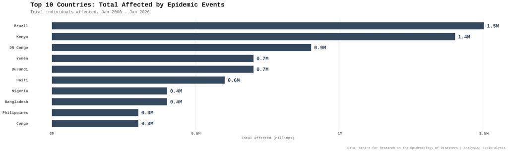 Nine of the top 10 countries for epidemic events are in Africa (Democratic Republic of Congo and Nigeria lead). People affected tell a different story — Brazil and Kenya top the list, showing that a few severe outbreaks (dengue, Zika, Ebola, cholera) can affect many even if events are fewer. Epidemic numbers dropped sharply after 2002 and continued a slow decline. People affected stayed mostly flat after 2003, with spikes in 2010–2011, 2019, and 2021.