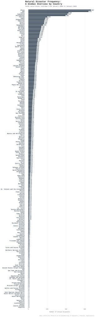 Small, local events often go unreported, so the numbers focus on bigger disasters. The data comes from UN agencies, news outlets, NGOs, and research groups. The COVID-19 pandemic is excluded. Only natural disasters are included here (technological ones like industrial accidents are left out).