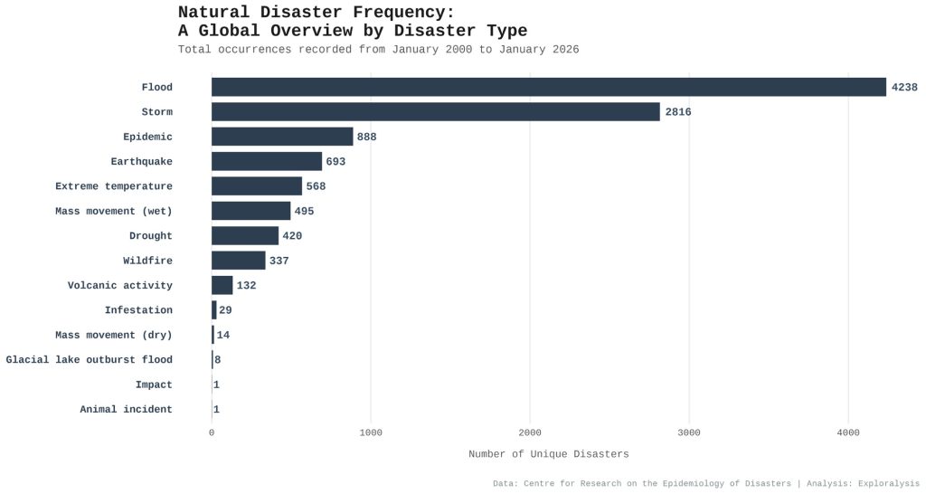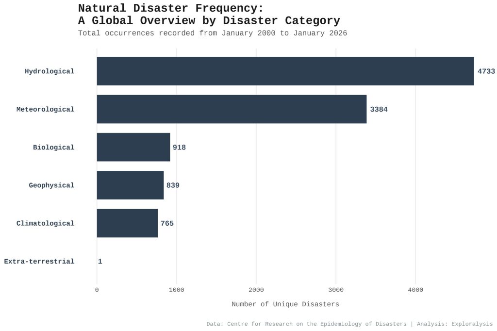 Natural disaster frequency: a global overview by disaster category (Exploralysis)