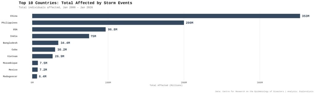The United States leads in storm events (384), followed by China and the Philippines. China and the Philippines suffer the most people affected (353 million and 200 million). Seven of the top 10 event countries are Asian; five of the top 10 affected countries are Asian.