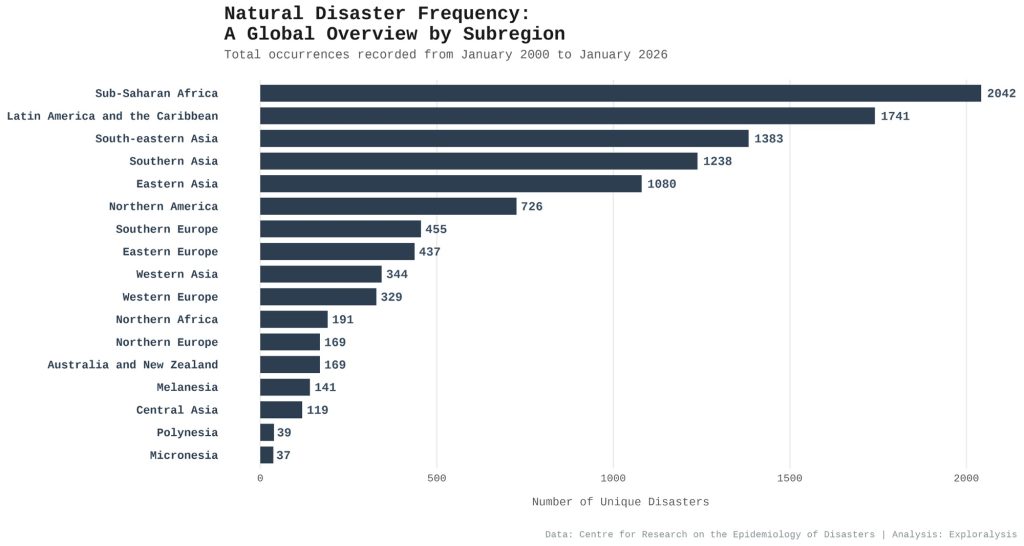 Natural disaster frequency: a global overview by disaster subregion (Exploralysis)