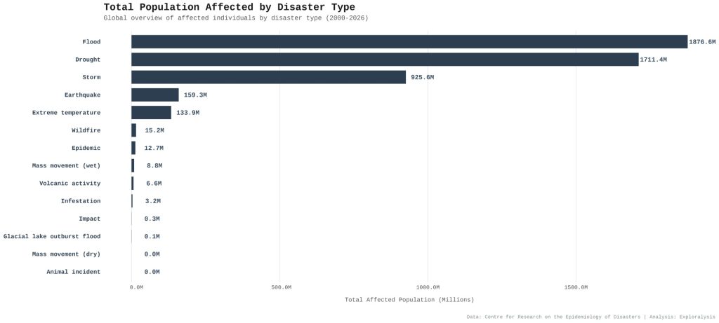Percentage contribution of disaster type to total affected population (2000-2026) (Exploralysis)