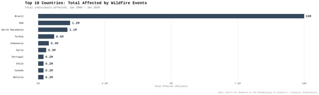 Top 10 countries: total affected by wildfire events (Exploralysis)