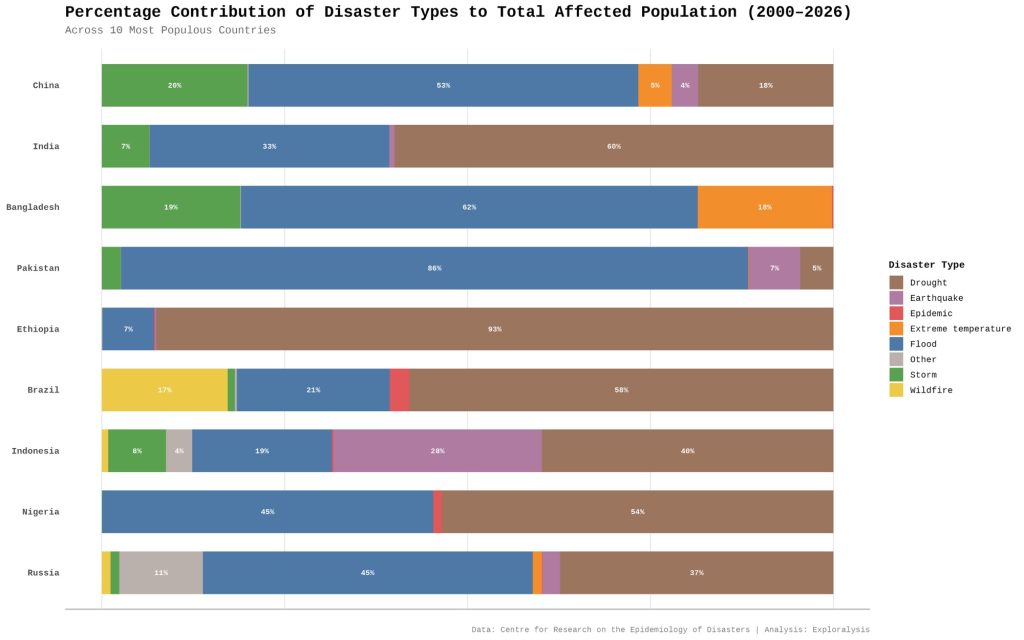Percentage contribution of disaster type to total affected population (2000-2026)​ (Exploralysis)