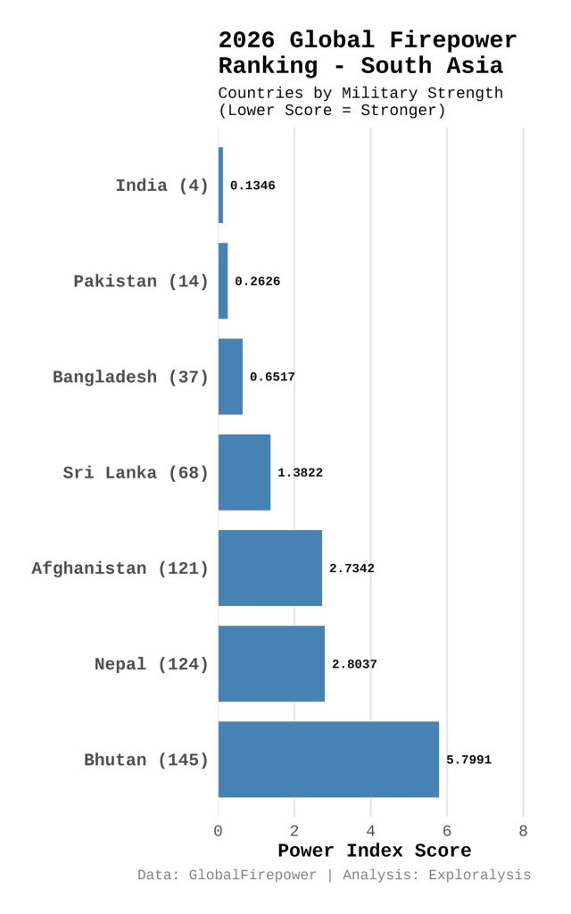 India leads, with Pakistan close behind and Bangladesh in third. These are also among the world’s most populous countries, highlighting population’s role. India and Pakistan’s nuclear arsenals add to their regional dominance. Bhutan is the clear weakest.