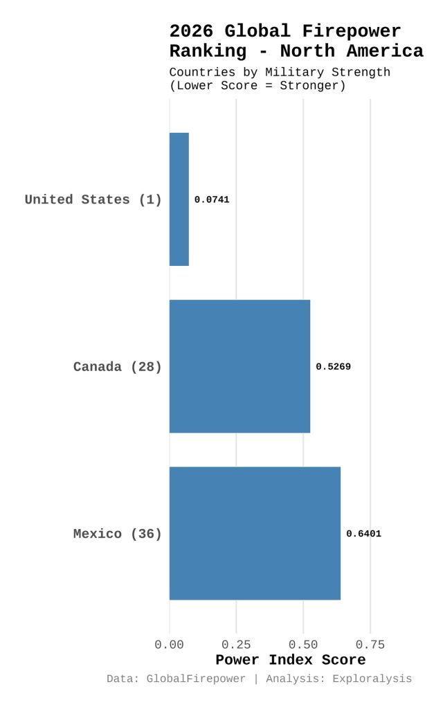 The U.S. is the global leader, far ahead of Canada and Mexico. Canada’s strength is closer to Mexico’s than to the U.S., despite the nuclear edge.