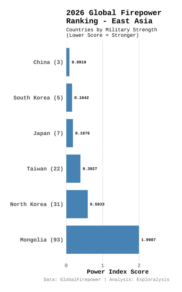 China leads decisively, followed by South Korea and Japan. China’s nukes boost its dominance. North Korea ranks lower despite its arsenal, with Mongolia weakest.